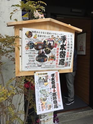 落語会は隔月の奇数月。その名も落語「手水まわし」にちなんだ「手水寄席」。社会人落語と先生の歯磨き講座の二部構成。最初は先生もかたかった。でもお客さん笑いにきてくれているので、先生のお話にも、ささやかなことで笑ってくださる。こうなると前でしゃべるのが楽しくなります。まずは形から(ココ大事)と、着物を買い、幟をしつらえ、提灯をつり(待合室に)、高座環境を整えます。次に修行。天満天神繁昌亭に落語を習いにいきました。歯磨き講座が「歯磨き噺」に変化。どんどん笑い声も大きくなります。