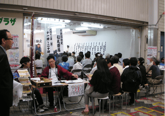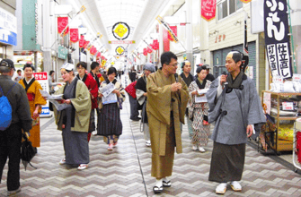 一カ所集中の落語会を分散しよう。と、地元の大学落研の学生さんたちに、練り歩いてもらったこともありました。遠くからわざわざ人が集まってくる宣伝効果はありませんが、そこにはあたかも「賑わっているような空気」が生まれます。これが大切。商人達の顔が明るくなっていきます。